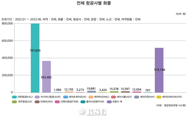 국내 항공사가 처리한 화물량은 총 124만5800t으로 전년 대비 0.7% 올랐다. 외국 항공사도 0.2% 증가한 51만6200t의 화물을 처리했다. 국내 항공사의 경우 대형항공사(FSC)와 저비용항공사(LCC) 간 희비가 교차했다. 우리나라를 대표하는 국적 항공사인 대한항공과 아시아나항공은 각각 79만7800t 36만3500t으로 0.7% 2.9% 하락했다.