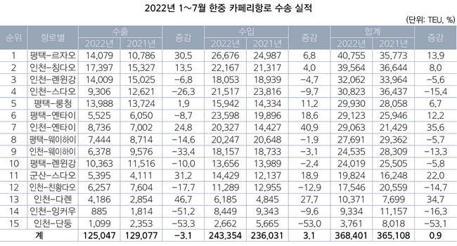 한중 카페리항로 물동량이 올해 들어 보합세를 보이는 가운데 정부에서 코로나19 사태 이후 도입했던 항비 감면 지원을 하반기부터 폐지하면서 선사들의 우려가 커지고 있다. 한중 관계 악화도 장기적으로 시장의 불투명성을 확대하는 요소다.
