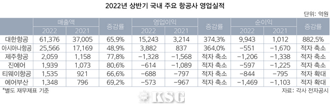대한항공의 상반기 별도 기준 매출액은 전년 동기 대비 65.9% 오른 6조1376억원을 기록했다. 영업이익과 순이익도 각각 1조5243억원 9804억원으로 4.7배(374.3%) 16배(1514.0%) 대폭 증가했다.