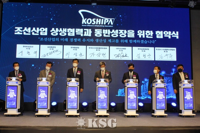 한편, 이날 행사에 참여한 현대중공업 대우조선해양 삼성중공업 현대삼호중공업 현대미포조선 등 5개사 대표와 한국조선해양플랜트협회장, 조선5사 사내협력사연합회장 등 조선업계는 조선업의 지속가능한 생태계를 조성하고, 미래 지향적 상생협력과 동반성장을 위해 ‘조선산업 상생협력과 동반성장을 위한 협약’을 체결했다.