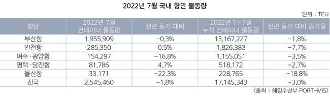 해양수산부에 따르면 올해 7월 전국 항만 컨테이너 물동량은 전년 동기 대비 1.8% 감소한 254만5500TEU를 기록했다. 코로나19 이전 시기인 2019년(250만9500TEU)에 비해선 1.4% 늘어났다. 전체 수출입 컨테이너 물동량도 1년 전 같은 시기와 견줘 1.5% 부진한 144만2400TEU로 집계됐다.