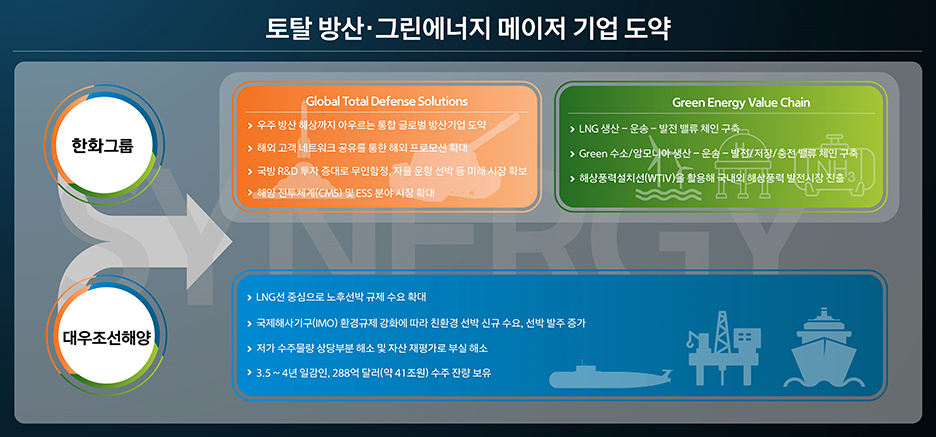 한화그룹은 핵심역량을 대우조선해양의 설계·생산 능력과 결합해 회사의 조기 흑자전환은 물론, 방산과 친환경 에너지 사업에서 '글로벌 메이저'로 성장하겠다는 포석이다.