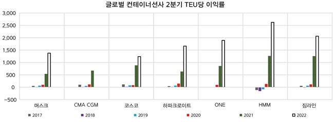 덴마크 해운조사기관인 시인텔리전스에 따르면 프랑스 CMA CGM을 제외한 글로벌 컨테이너선사 6곳의 올해 2분기 TEU당 평균 이익률은 전년 904달러에서 2배(100%) 증가한 1809달러를 기록했다. 2년 전 109달러와 비교하면 무려 17배(1560%) 폭증한 수치다.