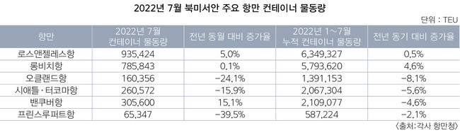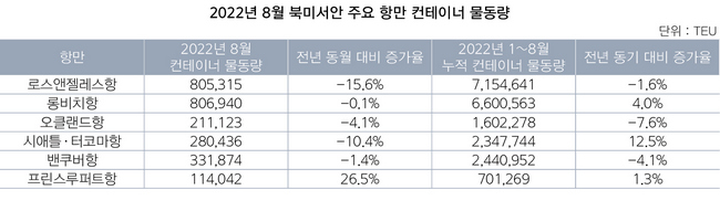 북미서안 7개 항만의 컨테이너 물동량이 하반기 들어 다시 고꾸라졌다. 계속된 인플레이션 압력과 글로벌 경기 침체로 소비 지출이 줄어들면서 해운 수요에도 영향을 끼쳤다는 분석이다. 미국소매협회는 올해 5월부터 물동량이 계속 약세를 띠고 있으며, 수요 부진이 지속되면서 연말까지 운임 하방 압력이 이어질 것으로 전망했다. 실제로 중국발 북미 서안 운임은 이달까지 14주 연속 하락하면서, 지난달에 견줘 1000달러 가까운 급락세를 보였다.