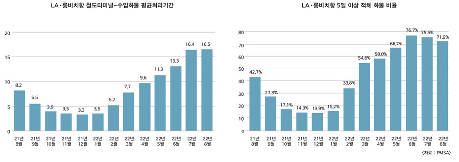북미서안항만의 컨테이너화물 처리기간은 점차 개선되고 있다. 미국 오클랜드 소재 태평양상선협회(PMSA)에 따르면 지난 8월 LA·롱비치 두 항구에서 수입 컨테이너가 화물차에 실려 반출되기까지 걸린 평균 체류기간(dwell time)은 5.1일로 전달(5.6일)보다 반나절 짧아졌다. 줄곧 부진했던 장기 체류 화물 비율도 다시 20%대까지 회복됐다. 5일 이상 터미널에 머문 화물 비중은 8월 24.1%로 전달보다 6.5%p(포인트) 하락했다.