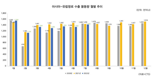 유럽 수출항로 물동량은 올해 1월 155만TEU로, 2019년 1월의 161만TEU에 이어 역대 두 번째 실적을 낸 뒤 2월에 감소세로 돌아선다. 러시아의 우크라이나 침공과 급격한 인플레이션에 따른 유럽지역 소비 부진이 해운 수요 감소의 원인으로 지목된다. 전통적 성수기인 7월에도 대내외 경기 불안 요인을 극복하지 못했다.