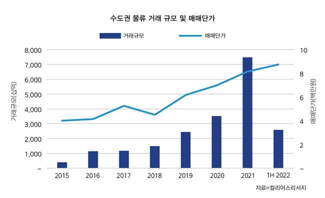 물류센터 거래 규모는 2015년부터 시나브로 증가세를 보이고 있다. 매매가가 높은 냉동물류창고를 대상으로 한 투자도 활발해지면서 물류센터 규모와 매매단가도 크게 뛰었다. 지난 5년간 500만~600만원선이었던 물류센터의 평당 거래가격은 지난해 800만원까지 상승했다.