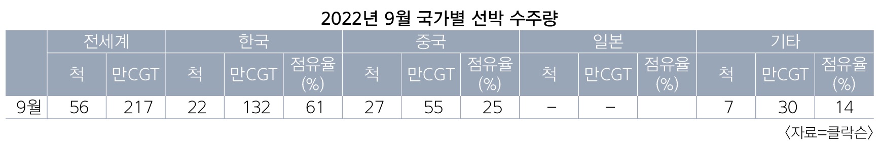 우리나라 조선사들은 9월 고부가인 LNG 운반선을 중심으로 일감을 확보했다.