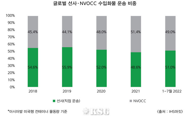 해상 컨테이너 시장은 2020년 초부터 항만 적체 등의 여파로 심각한 물류대란을 경험한 바 있다. 그 결과 미국 수입 컨테이너 중 NVOCC의 처리 비율은 2020년 48.0%로 코로나19 이전 시기인 2019년과 견줘 3.9%p 상승했다. 이후 2021년엔 51.4%까지 확대되며 NVOCC의 시장 장악력이 더 커졌다.