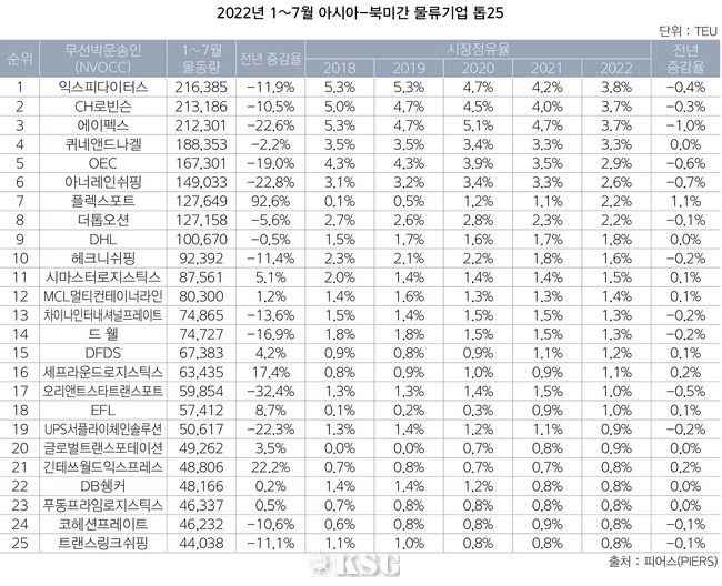 미국 플렉스포트를 포함해 중국 세프라운드로지스틱스와 일본 긴테쓰월드익스프레스(KWE) 등 세 기업은 두 자릿수 물동량 증가세를 보이며 호실적을 거뒀다. 16위 세프라운드로지스틱스와 21위 긴테쓰는 각각 6만3435TEU(17.4%) 4만8806TEU(22.2%)로 집계됐다. 긴테쓰는 일본계 중 유일한 톱 25 기업에 포함됐다.