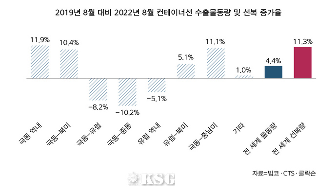 하지만 올해 하반기부터 시황이 급속히 하락하고 있다. 물동량은 둔화되고 항만 적체는 진정되는 모양새다. 빔코는 올해 8월 물동량이 지난 2월 이래 가장 낮은 수준을 보이며 전달인 7월에 비해 3.8%, 지난해 같은 달 대비 4.6% 감소하는 부진을 보였다고 전했다. 2019년 8월에 비해선 4.4% 증가에 그치는 등 코로나 이전 시기와 비교한 성장률도 크게 꺾였다.