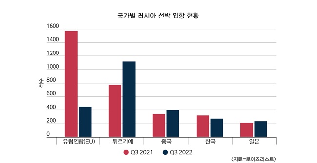지난해 3분기(7~9월) EU에 입항한 러시아 선박은 1610척에 달했지만 올해 450척으로 72% 급감했다. 반면 튀르키예에 뱃머리를 댄 러시아 선박은 전년 774척 대비 45% 늘어난 1119척로 크게 늘었다.