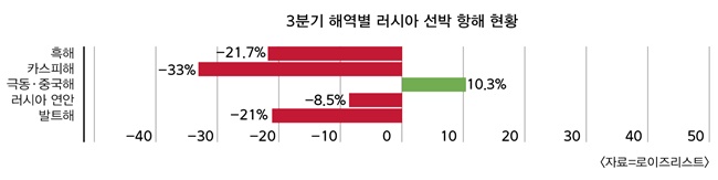 로이즈리스트에 따르면 EU와 영국 미국 등의 제재로 3분기 167개 러시아 항만에서 출항한 선박은 전년 대비 60% 줄었다.