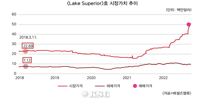 베셀즈밸류는 지난 9월 싱가포르 이스턴퍼시픽쉬핑(EPS)이 15년 선령의 4902대급 선박 <레이크슈피리어>호(2007년 6월 샤먼조선 건조)를 5000만달러에 매각한 소식을 전했다. 지난해 초까지 2000만달러를 밑돌던 이 선박 가격은 올해 들어 3000만달러를 돌파하더니 급기야 사상 최고가를 찍었다. 아울러 2006년 11월 건조된 자매선 <레이크키부>호의 가격을 6000만달러로 책정한 것으로 알려졌다.