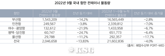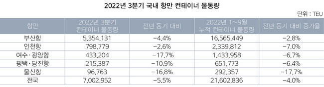 해양수산부에 따르면 올해 3분기 전국 항만 컨테이너 물동량은 전년 동기 대비 5.5% 하락한 700만2900TEU를 기록했다. 코로나19 이전 시기인 2019년(719만4400TEU)과 견줘 2.7% 감소했다.