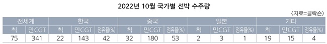 영국 조선해운조사기관인 클락슨에 따르면 우리나라는 10월 한 달 동안 143만CGT(수정환산톤수)를 수주해 180만CGT인 중국에 밀리며 세계 2위를 기록했다.