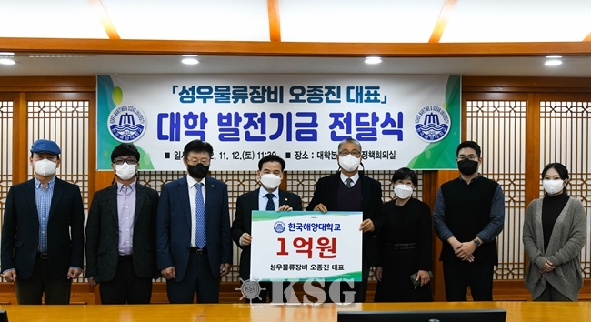 지난 11월12일 대학본부에서 열린 발전기금 전달식에는 오종진 성우물류장비 대표와 도덕희 한국해양대 총장 등 양 기관 주요 관계자들이 참석했다.