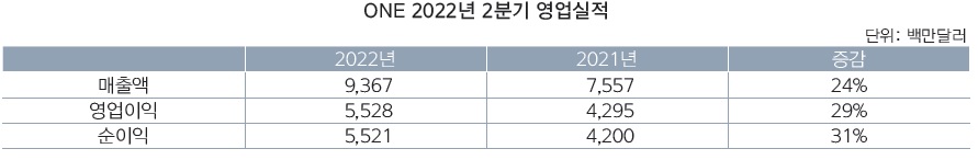 ONE은 영업보고를 통해 2022년 회계연도 2분기(7~9월) 영업이익 55억2800만달러(약 7조8400억원), 순이익 55억2100만달러(약 7조8300억원)를 각각 거뒀다고 밝혔다.