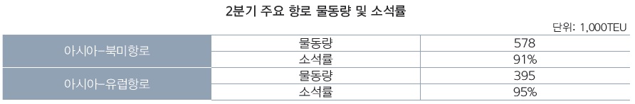 2분기 원양항로 화물적재율(소석률)은 전년 보다는 하락했지만 90%대의 높은 수준을 보였다. 북미 수출항로는 전년 대비 9%포인트(p) 떨어진 91%, 유럽 수출항로는 5%p 하락한 95%로 각각 집계됐다.
