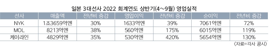 일본 3대 해운사(NYK MOL 케이라인)는 2022 회계연도 상반기(4~9월) 컨테이너선과 벌크선 부문에서 큰 폭의 성장세를 보이며 매출과 이익이 동반 증가했다. 특히 세 선사는 벌크선 부문에서 30% 이상의 높은 영업이익 증가율을 기록했다.