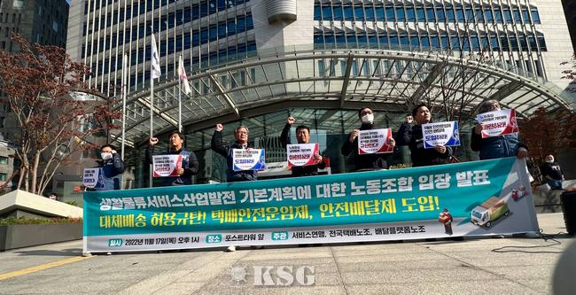 진경호 민주노총 택배노조 위원장은 “현재 배송근로자들은 경유가 인상과 기타 비용이 오르면서 실질임금이 크게 하락한 만큼 근로자 처우 개선을 위한 구체적인 계획이 반영돼야 한다”고 말했다.