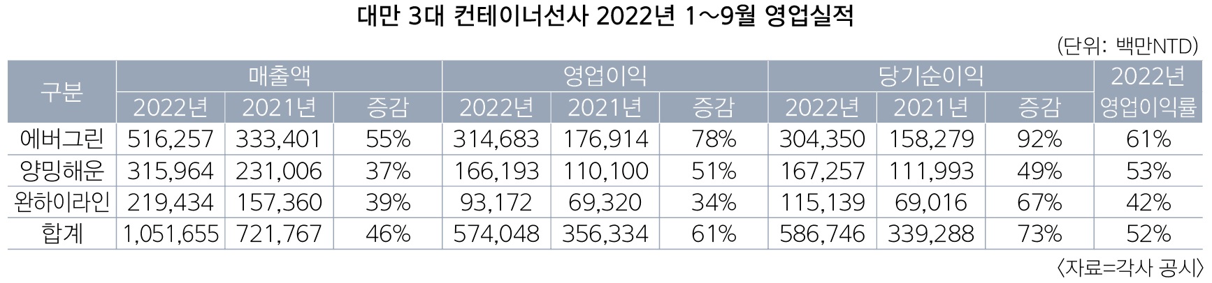 각사 공시에 따르면 올해 3분기(7~9월) 3개 선사의 영업이익 순이익 총액은 2021년 1737억대만달러(NTD) 1654억NTD에서 각각 1% 13% 신장한 1753억NTD(약 7조6000억원) 1872억NTD(약 8조1000억원)로 집계됐다.