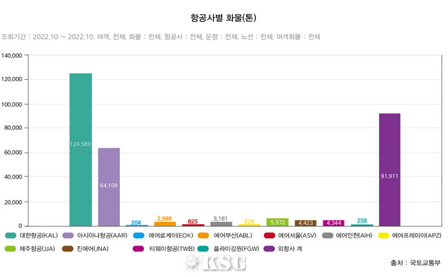 국내 항공사가 처리한 화물량은 총 21만1522t으로 전년 동기 대비 6.1% 감소했다. 외국 항공사도 0.5% 줄어든 9만1911t의 화물을 처리했다. 우리나라를 대표하는 국적항공사인 대한항공과 아시아나항공은 각각 13.6% 5.6% 하락한 12만4589t 6만4109t을 거뒀다.