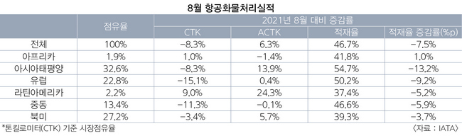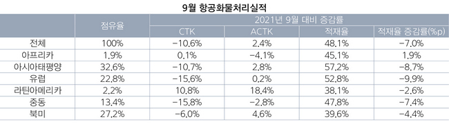 세 번째로 큰 화물 시장을 자랑하는 유럽의 10월 CTK는 1년 전 같은 시기와 견줘 18.8% 추락했고, 중동(점유율 13.4%)의 CTK도 15.0% 감소했다. 소수 시장인 중남미(점유율 2.2%)와 아프리카(점유율 1.9%) 지역의 CTK도 각각 1.4% 8.3% 역신장했다. 중남미의 전달 대비 CTK는 2021년 3월 이후 1년 7개월 만에 마이너스 성장을 거듭했다.