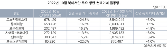 북미서안항만 물동량이 4개월 연속 후퇴했다. 경기 침체 우려에 따른 수요 위축과 더불어 선사들의 결항(블랭크세일링), 연휴 특수물량 조기 운송 등이 이어지면서 성수기 효과가 실종됐다는 분석이다. 각 항만당국에 따르면 북미 서안 7개 항만의 올해 10월 컨테이너 물동량은 전년 동월 대비 15.7% 하락한 220만5945TEU로 집계됐다. 코로나19 이전 시기인 2019년(230만9227TEU)와 견줘 4.5% 역신장했다.