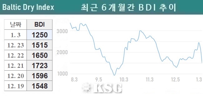 2023년 첫 건화물선 운임지수(BDI)는 1250으로 마감됐다. 작년 첫 BDI가 2285포인트였던 것과 비교해 절반을 조금 넘는 수준이다. 아직 유럽과 미국 등 주요 서구권 국가들이 휴일에서 온전히 복귀하지 않으면서 시황 하락에 영향을 끼쳤다. 한국해양진흥공사가 발표하는 한국형 건화물선운임지수(KDCI)는 1만3196으로 작년 마지막으로 발표된 12월23일보다 2446포인트 떨어졌다.