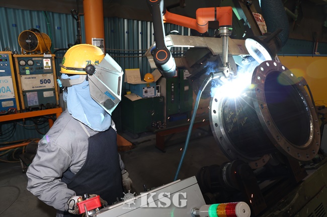 대우조선해양은 작업 환경을 개선하고 생산성 향상을 기대할 수 있는 탄소강관 용접 협동로봇을 개발, 현장에 적용하고 있다고 9일 밝혔다.