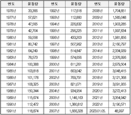 | ▼연도별 인천항 컨테이너 물동량(1976년~2022년) |