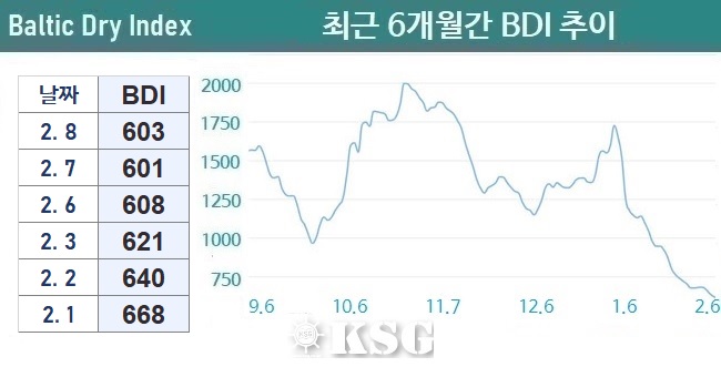 2월8일 건화물선 운임지수(BDI)는 전일보다 2포인트 상승한 603으로 마감됐다. 이날 벌크시장은 케이프선의 상승세 지속에 힘입어 BDI는 1주일만에 반등에 성공했다. 파나막스 시장도 하락 폭이 감소했지만, 수프라막스 시장은 약세가 지속됐다.한국해양진흥공사가 발표하는 한국형 건화물선 운임지수(KDCI)는 2월8일 기준 7881로 전일보다 42포인트 하락했다.