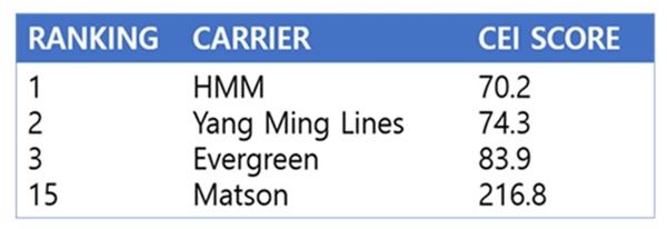 대만 선사들은 HMM에 이어 동아시아-美 서안 구간 탄소배출지수에서 2~3위를 차지했다. 양밍해운은 74.3으로 2위, 에버그린은 83.9로 3위를 각각 차지했다. 미국 선사 맷슨은 216.8%를 기록, 15위에 자리했다.