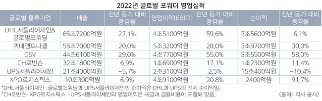독일 DHL의 물류사업부문인 DHL서플라이체인과 DHL글로벌포워딩은 2022년 최다 매출 실적을 올린 포워더로 선정됐다. 두 사업 부문의 합계 매출액과 영업이익은 각각 466억4300만유로(65조8200억원) 32억400만유로(4조5200억원)로 전년 대비 27.1% 59.6% 증가했다. 개별 실적만 놓고 보면 DHL글로벌포워딩의 매출액은 32.3% 늘어난 302억1200만유로(42조6600억원), 영업이익은 77.4% 오른 23억1100만유로(3조2600억원)를 기록했다. DHL서플라이체인의 경우 매출액은 18.5% 상승한 164억3100만유로(23조2000억원), 영업이익은 26.7% 증가한 8억9300만유로(1조2600억원)였다.