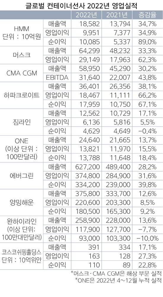 컨테이너선사들이 기간항로에서의 운임 상승에 힘입어 2021년에 이어 지난해에도 역대급 실적을 냈다. 대만 완하이라인을 제외한 글로벌 선사 9곳의 매출과 이익이 대폭 개선되며 사상 최대 실적을 갈아치웠다.
