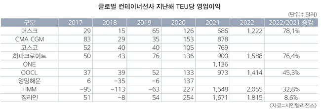 우리나라 HMM도 전년 대비 두 자릿수 증가한 영업이익을 거뒀다. 특히, 20피트 컨테이너(TEU)당 영업이익은 2055달러로, 글로벌 선사 중에서 가장 높은 수치를 기록했다.