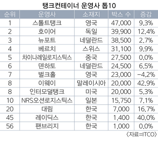 중국 시노켐 자회사인 뉴포트는 3% 늘어난 3만8500개였다. 이어 스위스 베르치는 10% 늘어난 3만1100개로, 4위를 유지했고 중국철도 물류자회사인 차이나레일웨이로지스틱스는 지난해와 같은 2만7500개였다. 중국 회사는 지난해 영국 벌크홀을 제치고 5위로 올라선 뒤 올해는 숨고르기에 들어갔다.