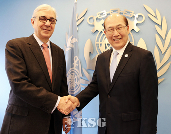 아래 사진 왼쪽) IMO 주재 특명전권대사는 지난달 28일 임기택 사무총장에게 선박 재활용 협약 가입 신청서를 전달했다.