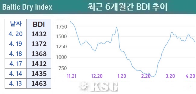 4월20일 건화물선 운임지수(BDI)는 전일보다 60포인트 오른 1432로 마감됐다. 이날 벌크시장은 케이프 시장에서 폭등하는 등 모든 선형에서 상승했다. 이에 따라 BDI는 다시 1400대로 올라섰다. 한국형 건화물선 운임지수(KDCI)는 4월20일 기준 1만4272달러로 전일보다 221달러 상승했다.
