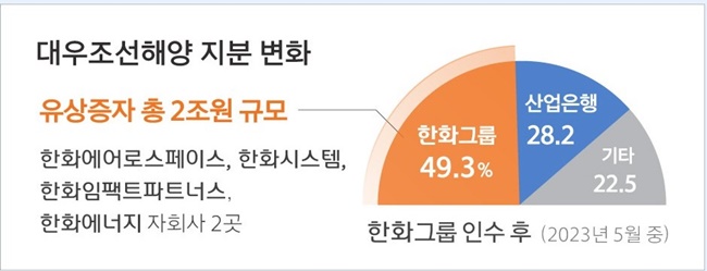 5월 한화에어로스페이스 한화시스템 한화임팩트파트너스 한화에너지 자회사 두 곳 등 한화그룹 5개사는 2조원 규모의 대우조선 유상증자에 참여한다. 이를 통해 대우조선 지분 49.3%를 확보하며 최대주주로 올라서게 된다.