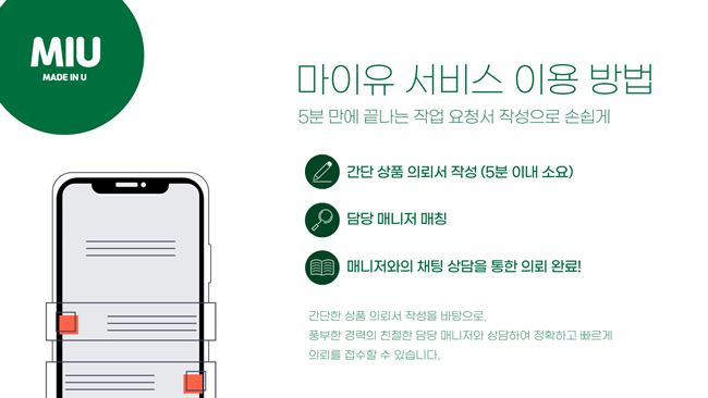 마이유는 의류 제작을 희망하는 기업과 의류를 생산하는 공장을 연결해 주는 플랫폼이다. 접근성이 낮아 생산 공장을 직접 찾기 어렵다는 점을 고려해 만들어진 서비스로, 휴대전화 애플리케이션(앱)을 이용해 의류 제작을 언제 어디서나 손쉽게 할 수 있다.