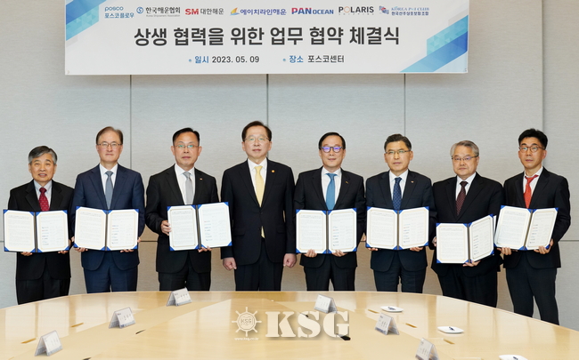 포스코플로우와 한국해운협회 대한해운 에이치라인해운 팬오션 폴라리스쉬핑, 한국선주상호보험조합(KP&I)은 9일 오후 서울 대치동 포스코센터에서 상생 협력을 위한 협약(MOU)을 체결했다.