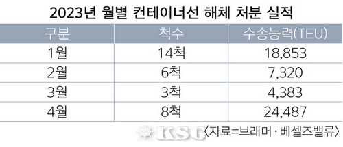 컨테이너선 시장 초호황으로 해체 실적이 전무했던 지난해 같은 기간에 비해 급증했지만 시황 부진 여파로 선사들이 폐선에 적극 나설 거란 전문가들의 예상엔 많이 못 미치는 수치다. 알파라이너는 앞서 올해 컨테이너선 폐선이 35만TEU에 이를 것으로 전망한 바 있다.