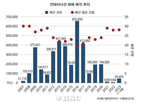 해체된 컨테이너선의 평균 나이는 28살로, 지난 2년과 비슷한 수준을 보였다. 2007~2008년 30년이었던 평균 해체 선령은 한진해운 사태가 일어난 2016년에 19살까지 떨어졌다가 코로나19 사태로 시황이 급등하면서 다시 늘어났다. 공급난이 극심해 해체 수요가 급감했던 2021년과 2022년의 폐선 선령은 평균 28~29년이었다.