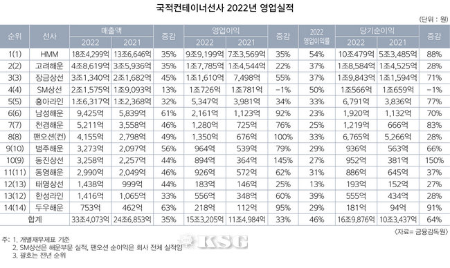 금융감독원에 따르면 2022년 한 해 국적 컨테이너선사 14곳이 거둔 매출액은 개별(별도) 재무제표 기준 33조4073억원을 기록했다. 2021년의 24조6853억원에서 35% 급증했다. 전년도의 101%엔 못 미치지만 여전히 30%대를 웃도는 괄목할 만한 증가율을 과시했다.