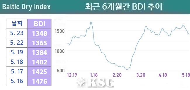5월23일 건화물선 운임지수(BDI)는 전일보다 17포인트 하락한 1348로 마감됐다. 이날 벌크시장은 모든 선형에서 신규 화물의 유입은 조금씩 늘어나 선복 적체가 조금씩 해결 기미를 보였지만 반등에 실패했다. 한국형 건화물선 운임지수(KDCI)는 5월23일 기준 1만3963달러로 전일보다 131달러 하락했다.