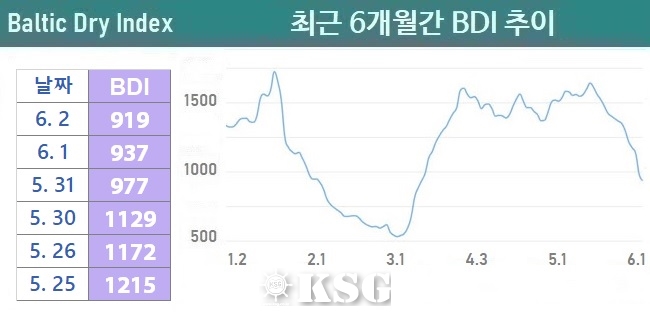 6월2일 건화물선 운임지수(BDI)는 전일보다 18포인트 하락한 919로 마감됐다. 지난 주 벌크시장은 모든 선형에서 침체된 모습을 보였지만 주 후반 파나막스 시장을 중심으로 조금씩 살아나는 모습을 보였다. 한국형 건화물선 운임지수(KDCI)는 6월2일 기준 1만658달러로 전주보다 16% 하락했다.