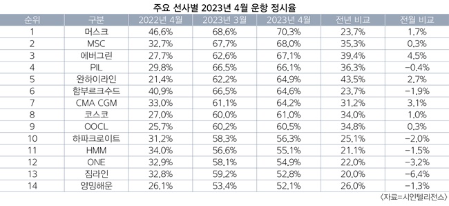 머스크는 전월 대비 1.7%p 상승한 70.3%의 정시율을 기록, 선사들 중에서 유일하게 70%대를 달성했다. 올해 1월 이후 4개월 연속 세계 1위 자리를 지켰다. 머스크는 지난해 11월 2021년 2월 이후 21개월 만에 1위 자리를 스위스 MSC에 빼앗겼지만 두 달 만에 정상에 오른 뒤 1위를 유지하고 있다.