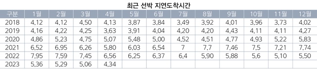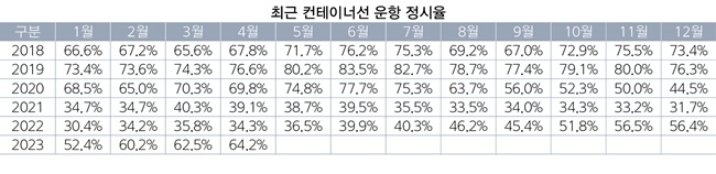 여전히 10척 중 4척가량이 지각하는 셈이지만 코로나 사태 기간 동안 겪은 최악의 상황은 벗어났다는 평가다. 코로나 기간인 2021~2022년 평균 운항 정시율은 각각 35.8% 42.3%에 그쳤다.